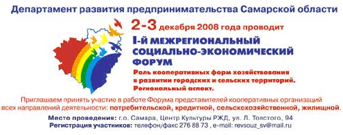 2 -3 декабря 2008 года Департамент развития предпринимательства Самарской области провел 1-й межрегиональный социально — экономический Форум «Роль кооперативных форм хозяйствования в развитии городских и сельских территорий. Региональный аспект». В рамках Форума состоялось обсуждение проблем и перспективных направлений развития всех видов кооперативных организаций. В работе Форума приняли участие представители: Совета Федерации Федерального Собрания Российской Федерации; Правительства Российской Федерации; Правительства Самарской области; руководители кооперативных организаций Самарской области и других регионов Российской Федерации. Работа Форума состоялась в формате пленарных заседаний, дискуссионных и учебных секций. В работе форума приняли участие представители СОКК РБ и руководители кредитных кооперативов республики. Подробнее.